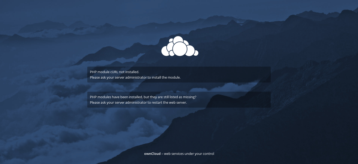 Setelah paket tersebut terpasang, alhamdulillah, pemasangan peladen ownCloud bisa dilanjutkan. Ulang proses, nanti akan memunculkan laman seperti ini, apabila tidak ada masalah lebih lanjut: