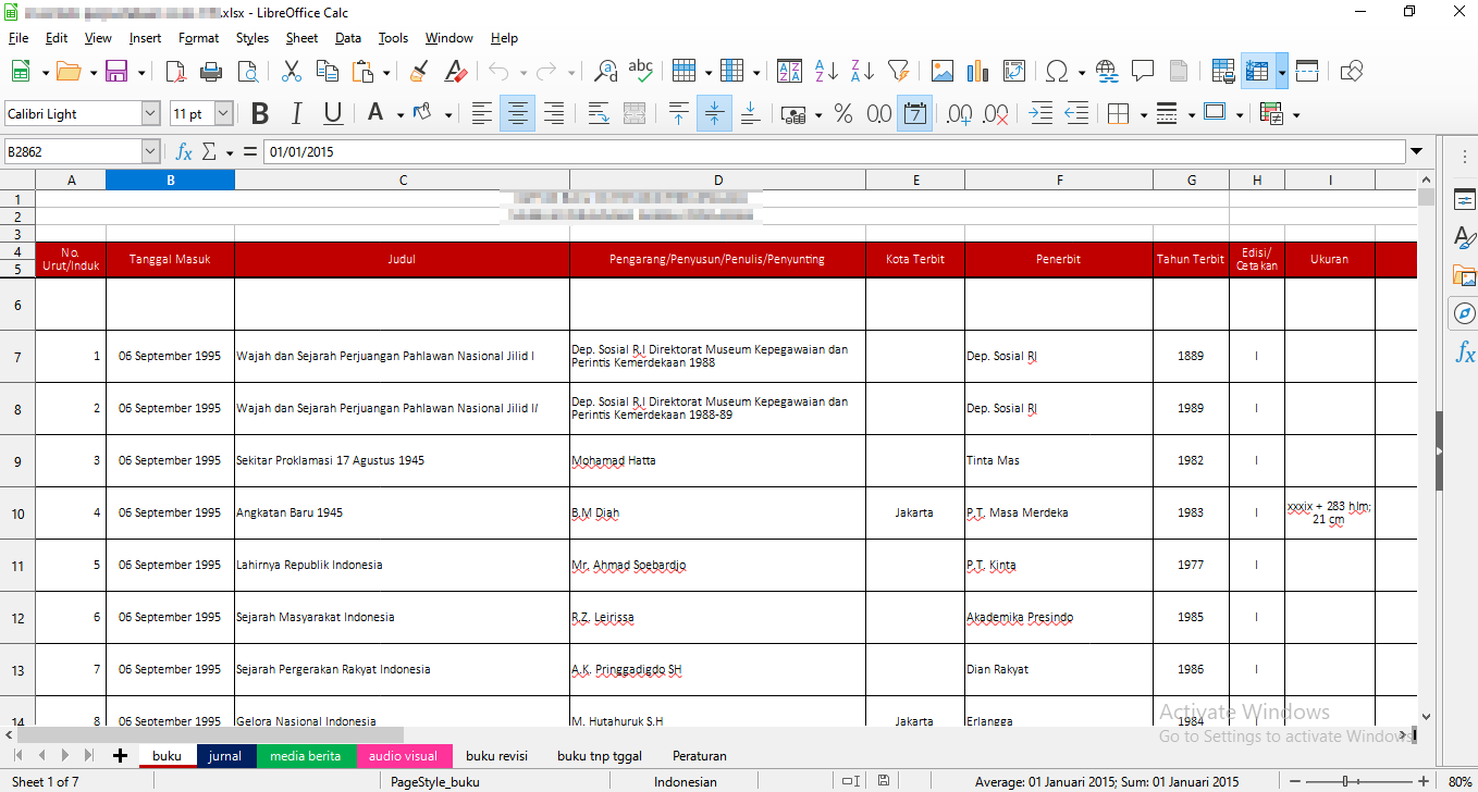 Contoh gambar di atas di ambil dari berkas dengan format .xlsx. Dari data tersebut, saya akan melakukan simulasi, dengan mengambil beberapa baris data dari berkas asli, yang kemudian saya rapihkan sesuai dengan posisi kolom data yang diterima oleh SLiMS.